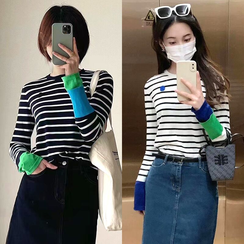 クールなストライプTシャツコットンストライプカラーマッチングクラシック長袖ボトムシャツレディース32