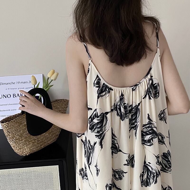 レトロ水墨プリントストラップワンピース気質がゆったりしたロングスカート女性2023夏100