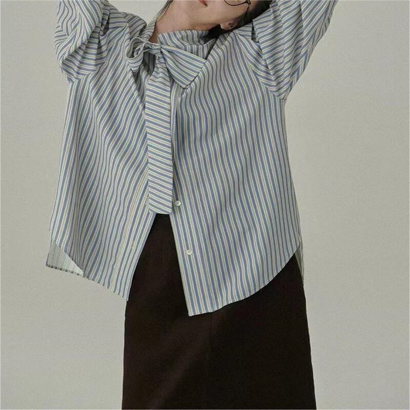 超絶品!アーティスティックな女の子の雰囲気のリボン付きゆったりストライプシャツトップス124