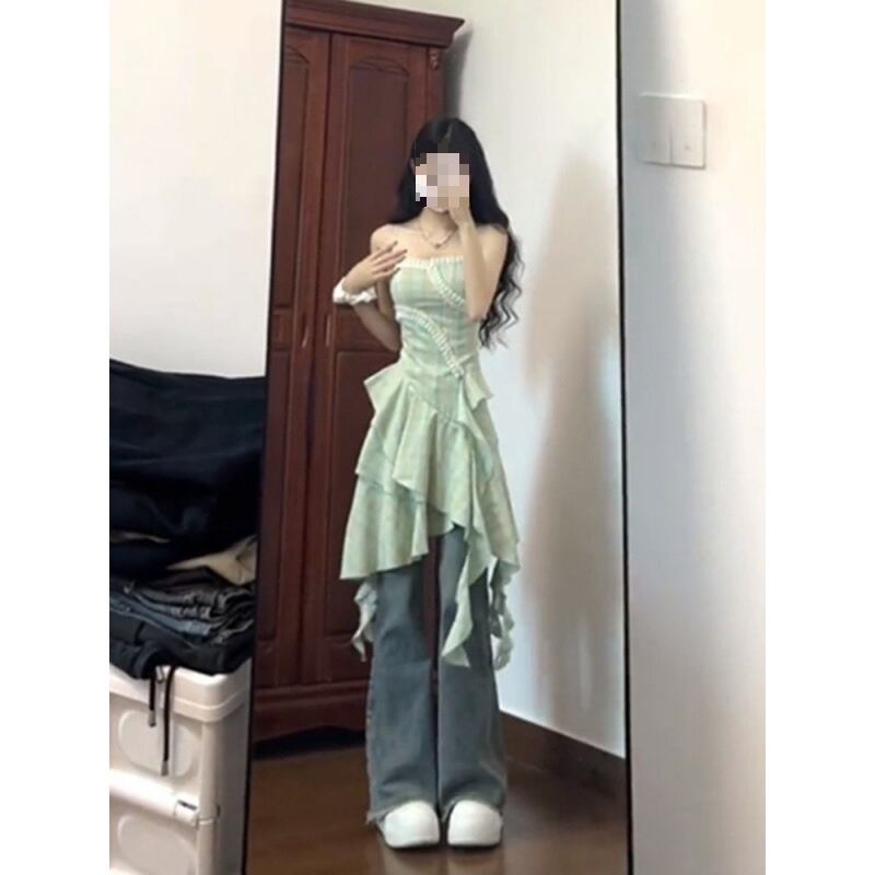 ミントグリーンのサスペンダーホットガールドレス女性のハイエンド夏のトレンディなデザインのフリルスカート150
