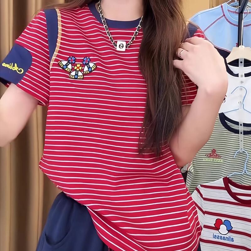 新しい季節を迎え、【純綿刺繍ストライプ半袖Tシャツレディース2025夏新作スタイルゆったりトレンドブランドラウンドネックトップ】が登場です!この素晴らしいアイテムは、夏にぴったりな純綿素材とトレンドのストライプデザインが特徴で、リラックスした着心地を提供します。