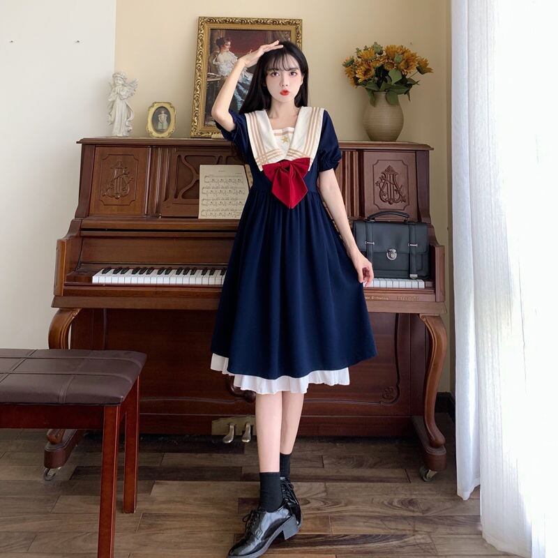 海軍の襟の少女JKの長いスカート 夏の大きいサイズ 半袖のロリータのワンピース228