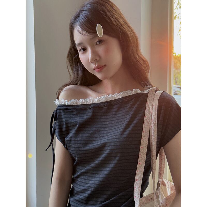 【南仏イメージ】歌铭レトロレース斜めがけ半袖ストライプtシャツ夏ショート丈トップス231