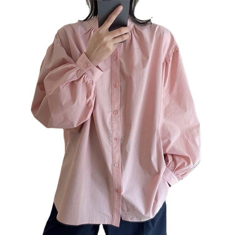 春夏新作韓国シックスタンドアップカラーシングルブレストランタンスリーブルーズカジュアル無地シャツ長袖和風271