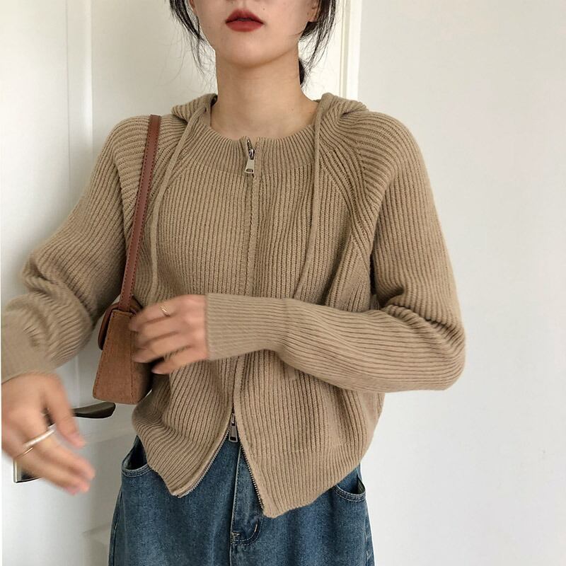 ジッパーフード付きニットカーディガン女性レトロなセーターコート女性秋冬デザイン376