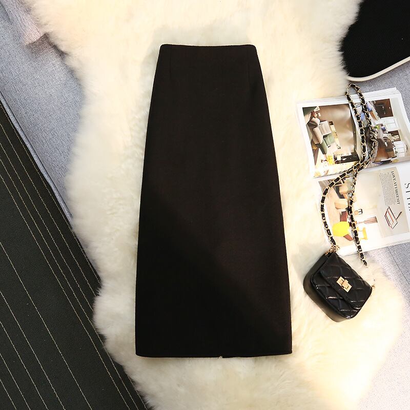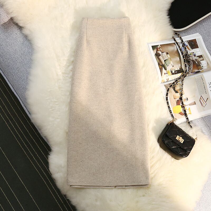 レディースウールスカートミドル丈2023新作ハイウエストスリットストレートワンステップスカートヒップスカート秋冬厚手400
