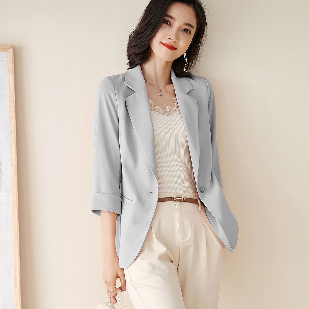 このスリムは、一粒のボタンがアクセントになっており、知的で優雅な印象を与えます。素材は軽やかで通気性が良く、春夏の季節に最適です。シンプルながらも独特の存在感があり、様々なボトムスとのコーディネートが楽しめるため、普段使いにもお出かけにもぴったりです!