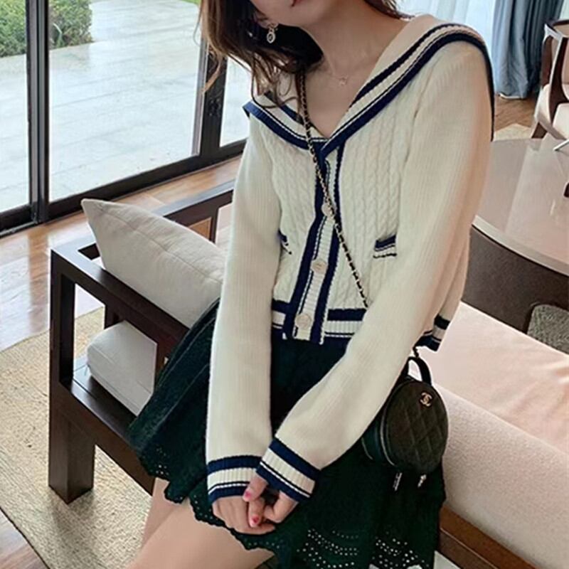 白いニットカーディガンの女性2023年秋の新型レトロな襟の短いセーターのコートの女性474