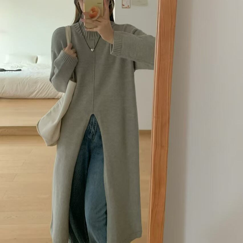 高襟オープンフォークニットワンピース女性秋冬新作デザイン感ゆったりカジュアルミディアムロングセーター498
