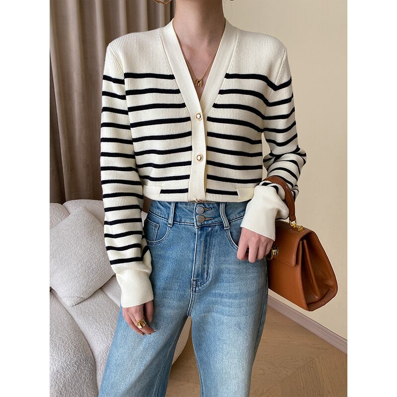 新しいシーズンにぴったりな、【おしゃれなフランス式のストライプの早秋vネックのニットのカーディガンのデザイン感】が登場です!このアイテムは、洗練されたデザインと快適な着用感を兼ね備え、秋のコーディネートに欠かせない一着となります。