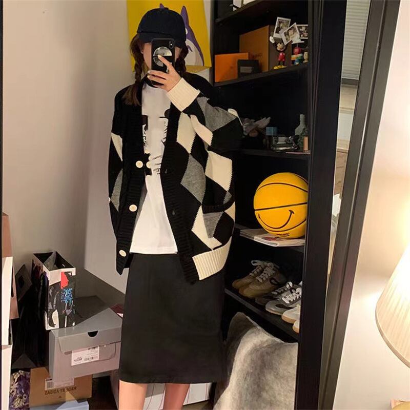 セーター2022秋新型の格子のニットのカーディガンゆったり復古のvネックは色のコート594