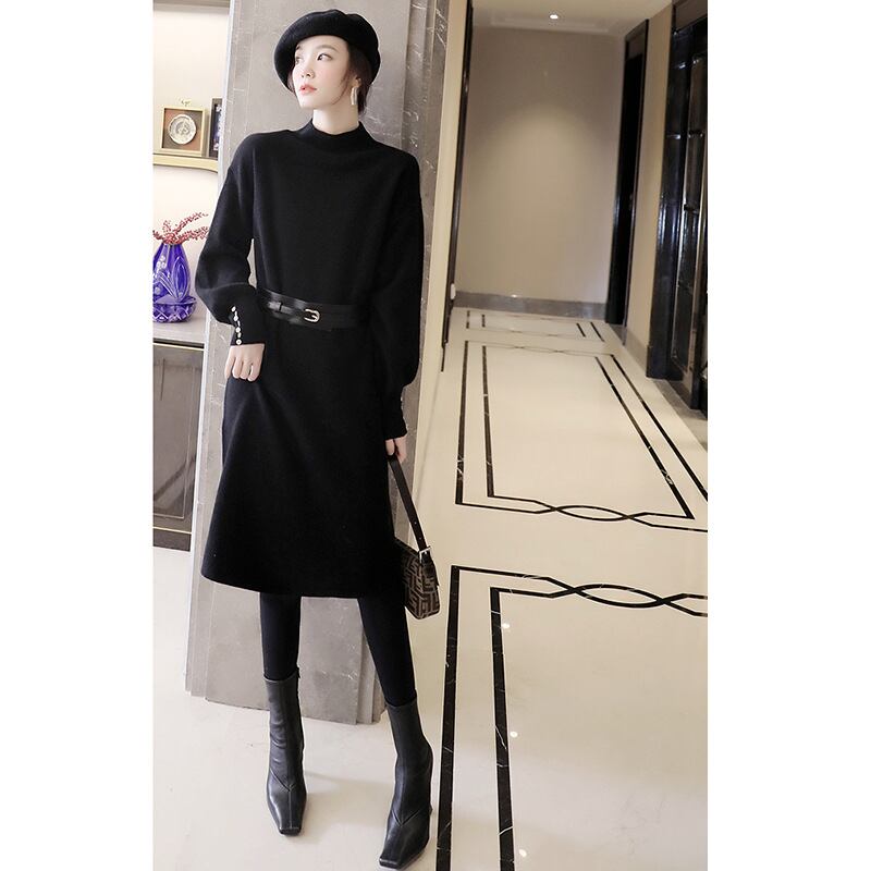 レトロなニットのワンピースの女性2023秋冬の袖の腰の半分の高襟のセーターのロングスカート599