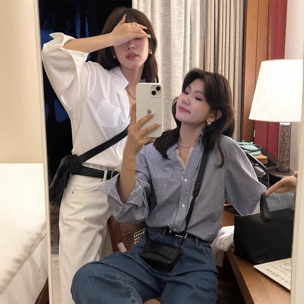 韓系カジュアル白いレースはゆったり襟のボタンの長袖のシャツ713