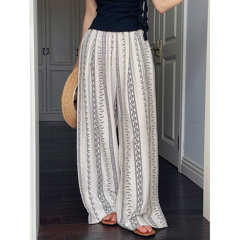 レトロプリントワイドレッグパンツ夏新作レイジースタイルリネンカジュアルパンツ825