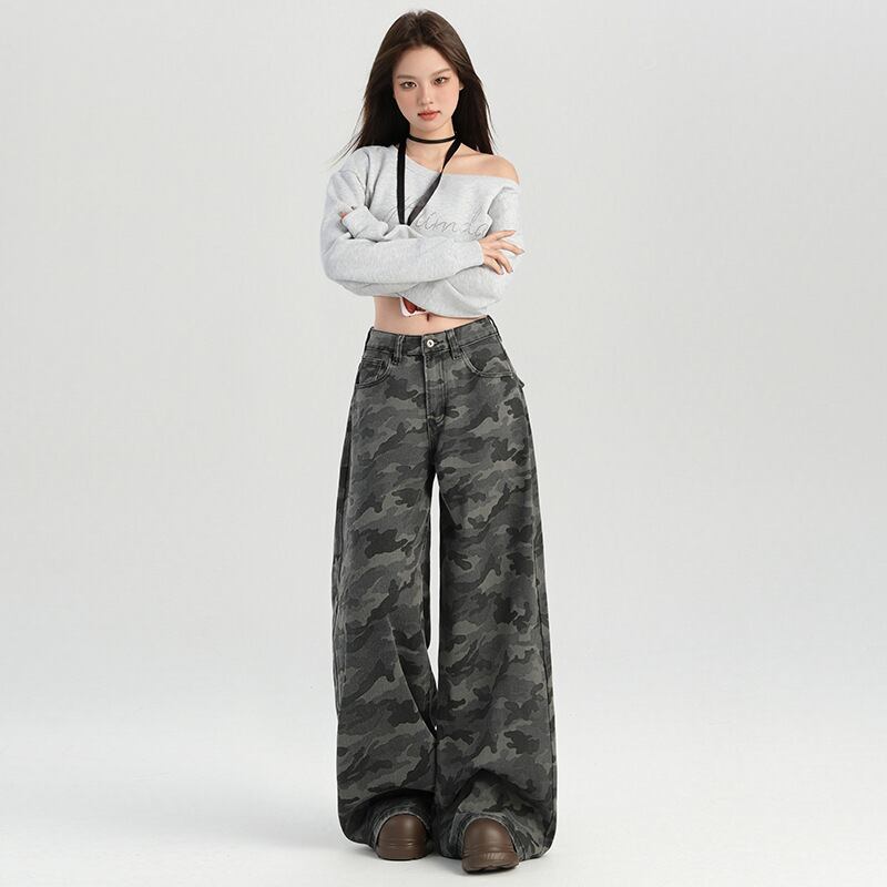 アメリカンホットガール迷彩ハイウエストワイドレッグカジュアルパンツ女性の夏の新しいハイストリートスリムフロアモップパンツ878