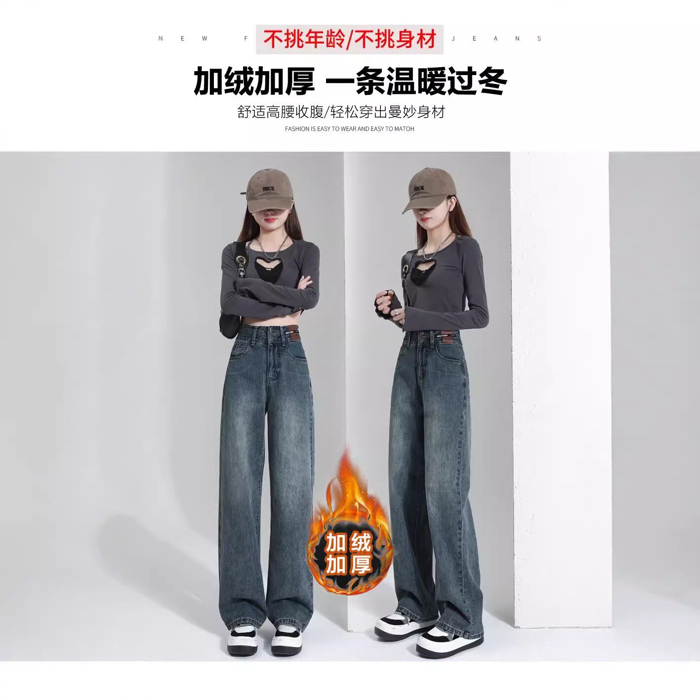 ベルベットの高腰ダブルボタンのストレートジーンズの女性2024の新しい小柄ゆったり垂れ下がった感じのズボン899