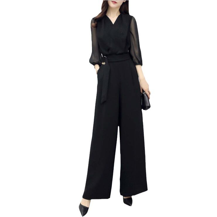 春夏新作ハイウエストシフォンワンピース黒袖スリムワイドレギンススーツ女性915