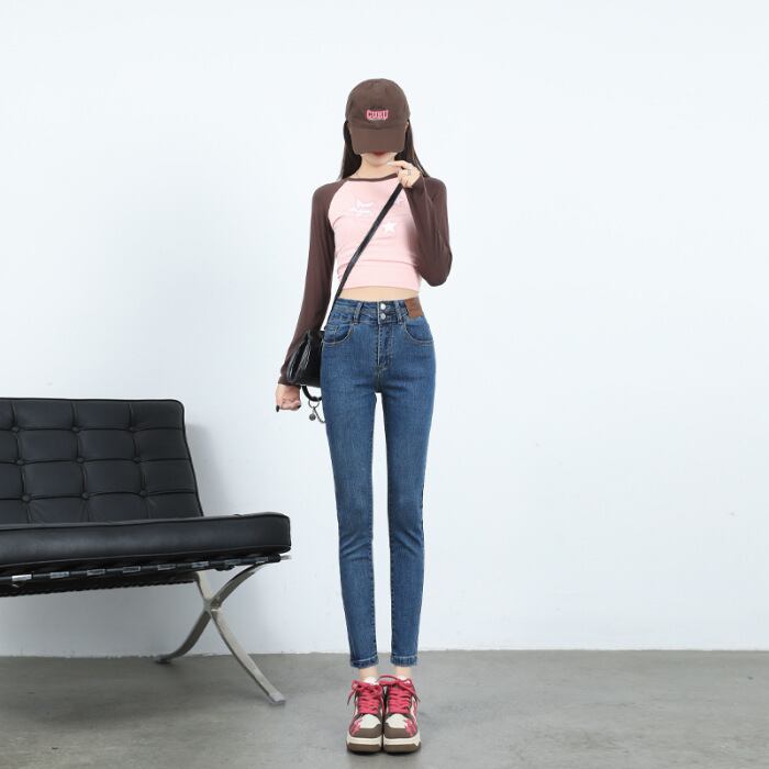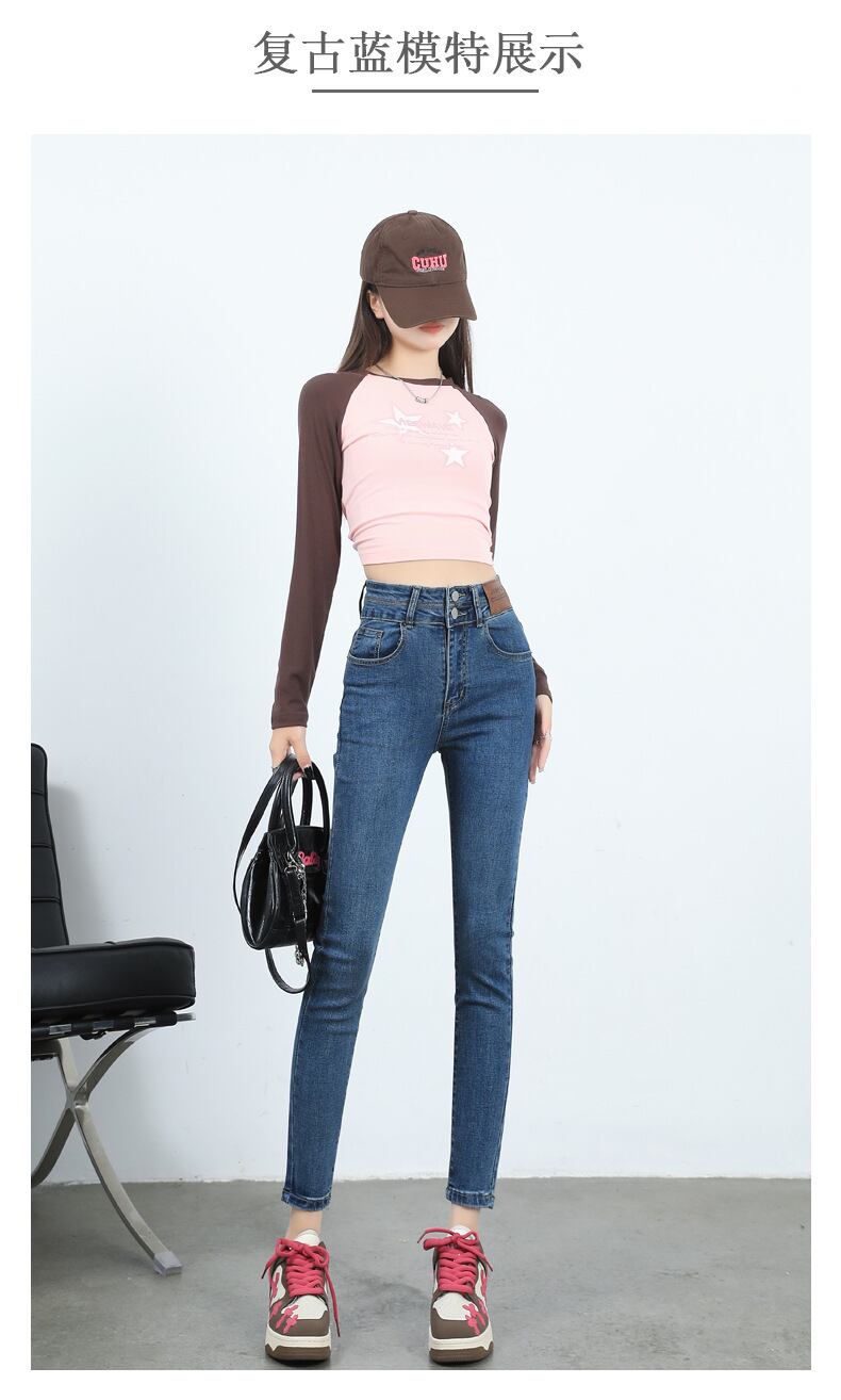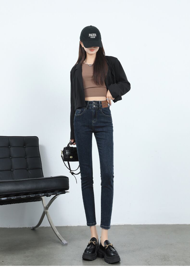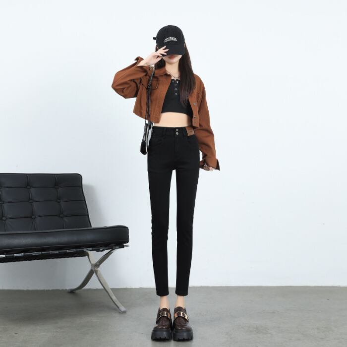 2023年秋冬ダブルボタンハイウエストスリムブラックプラスベルベットスモールフットクロップドジーンズレディースタイトストレッチペンシルパンツ916