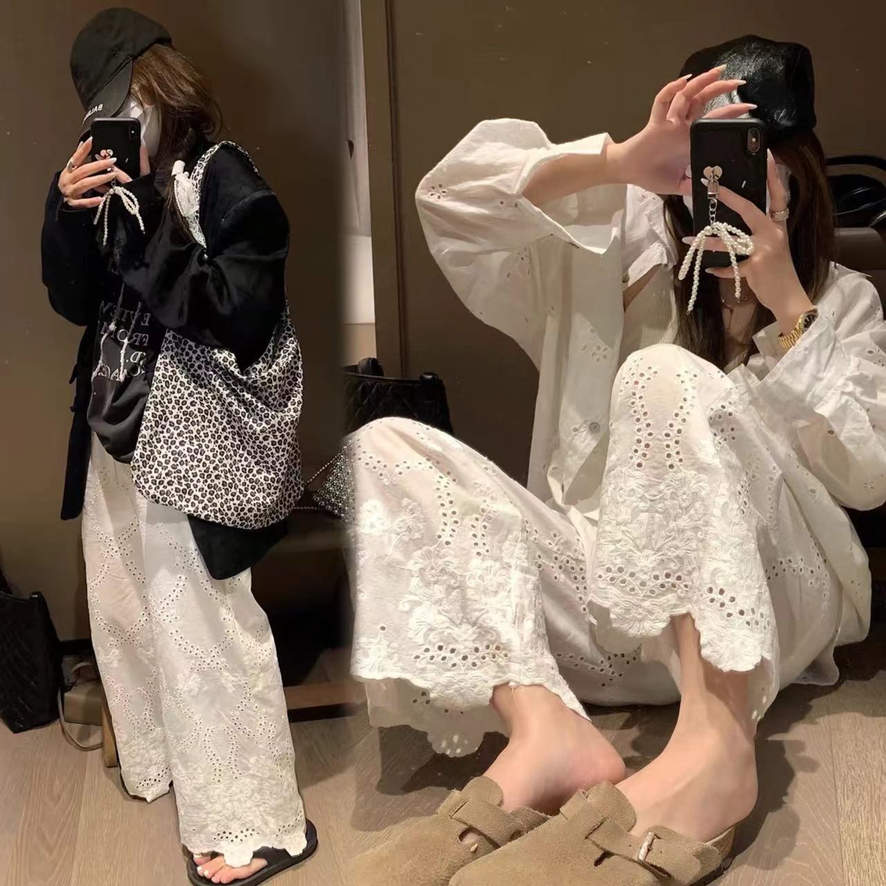 白いレースの花の透かし彫りの刺繍の広い足のズボンの女性の2024夏の薄いタイプの垂れ下がった感じのカジュアルなズボン924