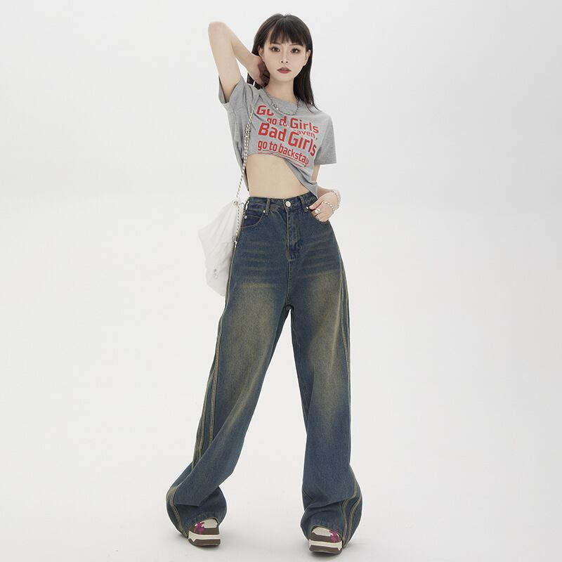 レトロな広脚ジーンズの女性2023アメリカのレトロな縞模様のデザインの高腰ストレートパンツ987